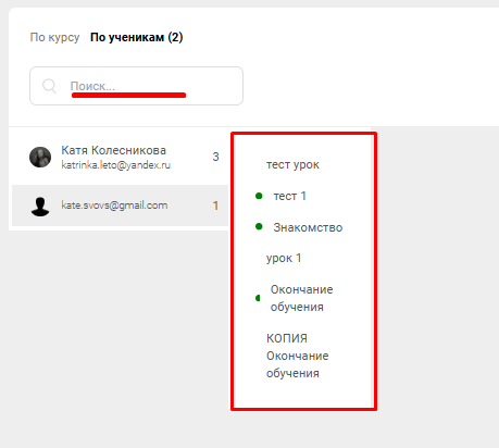 Поиск ученика осуществяется по адресу почты. Чтобы открыть список уроков, нажмите на иконку с данными ученика
